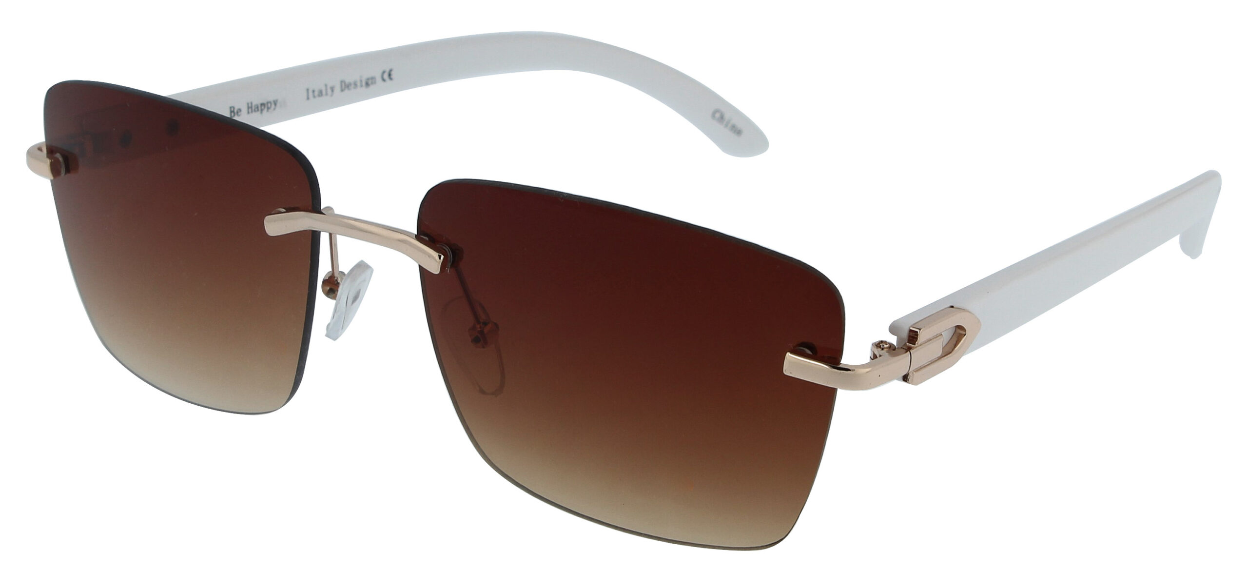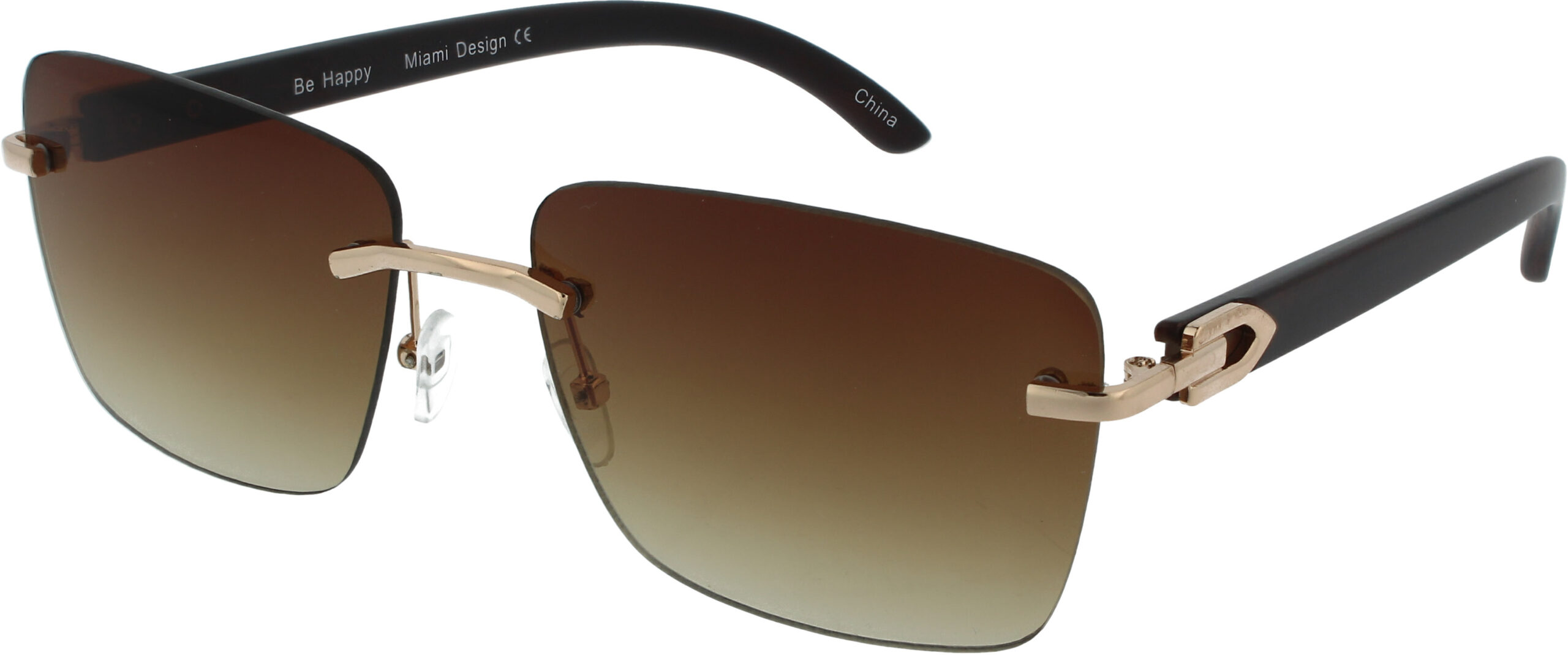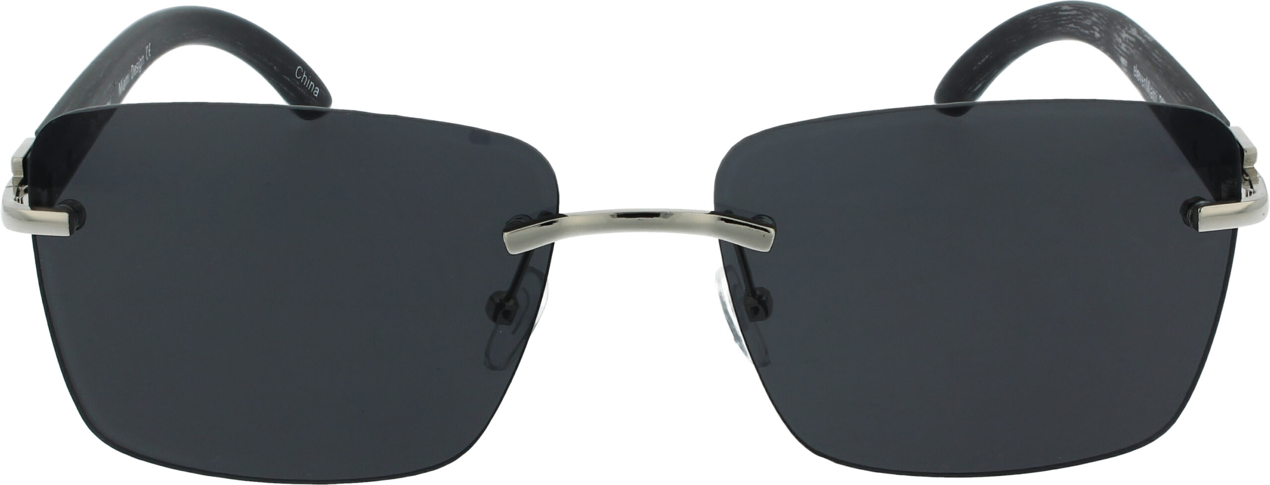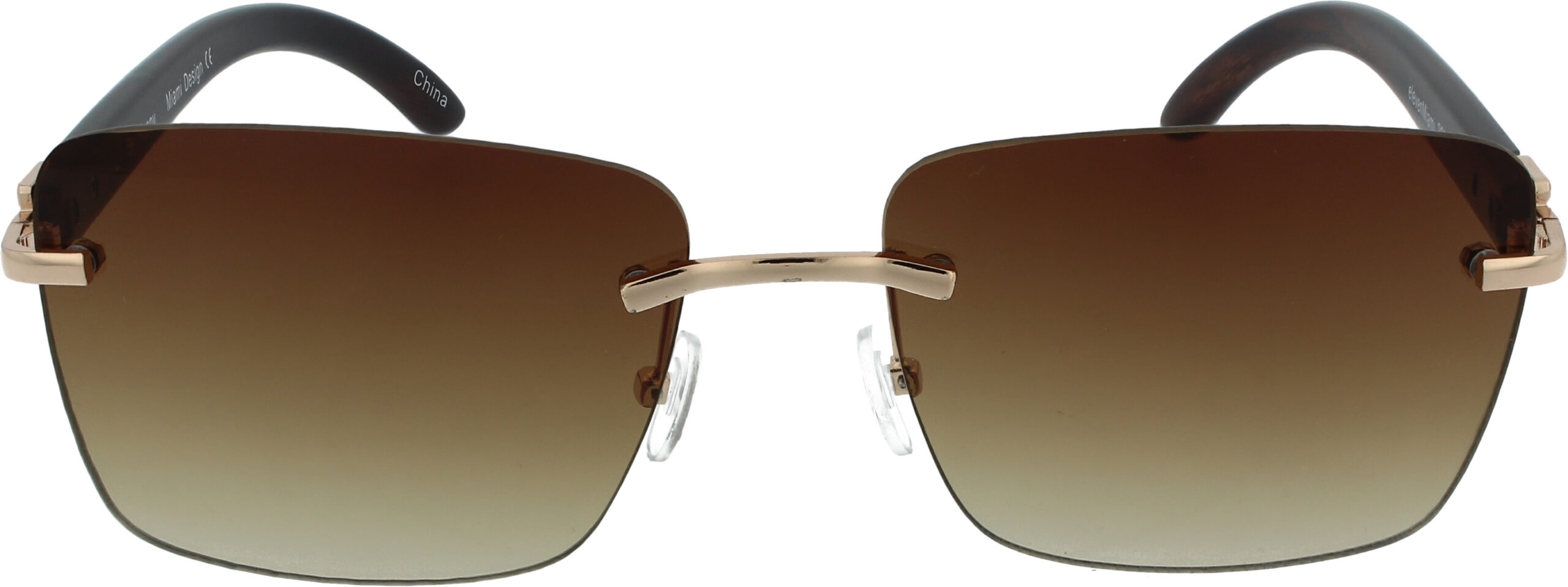 Frameless sunglasses with adjustable nose pads and wooden style temples. With 100% UV protection.